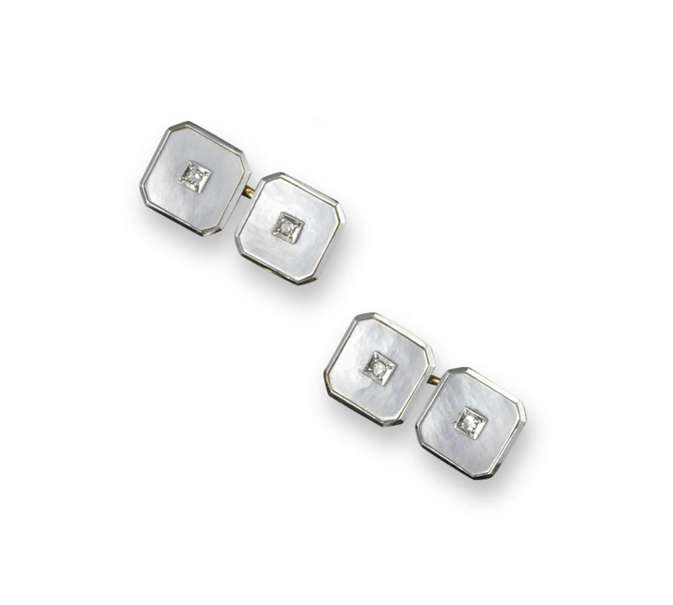 A cased set of dress cufflinks and studs, of square octagonal form and centred with a small diamond on shell ground, in gold and platinum, comprising a pair of cufflinks, four larger dress studs and two smaller.