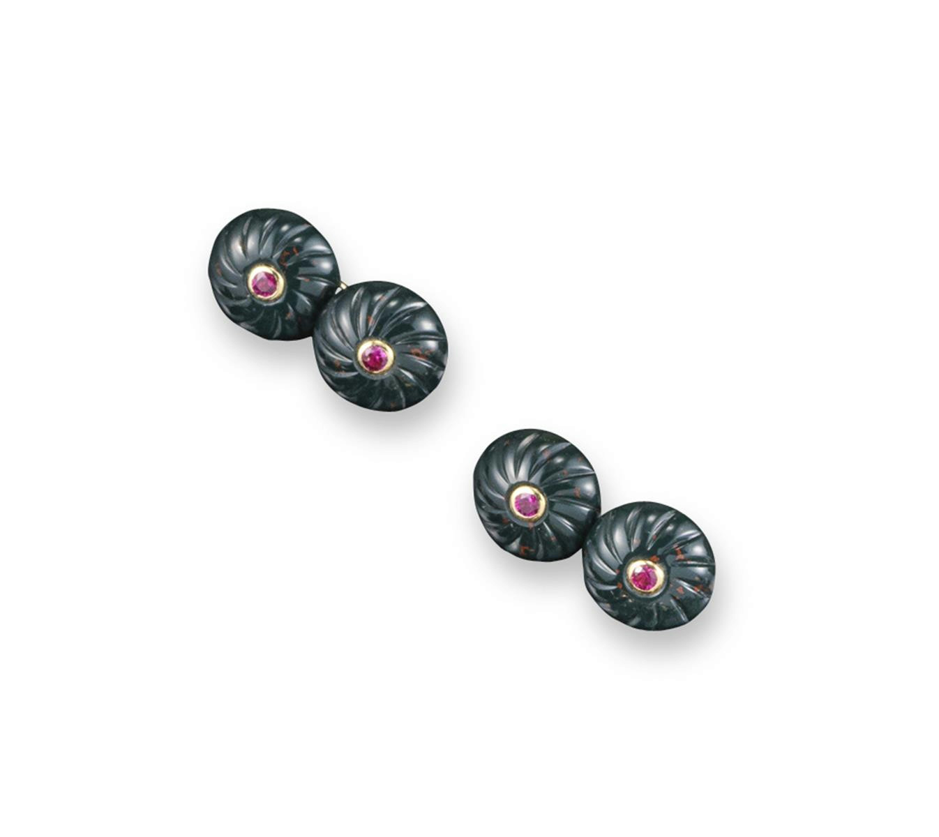 A pair of bloodstone cufflinks, the carved circular bloodstone discs set with a central circular cut ruby in yellow gold. Marked Trianon and 750. Each disc 1.2cm diameter.