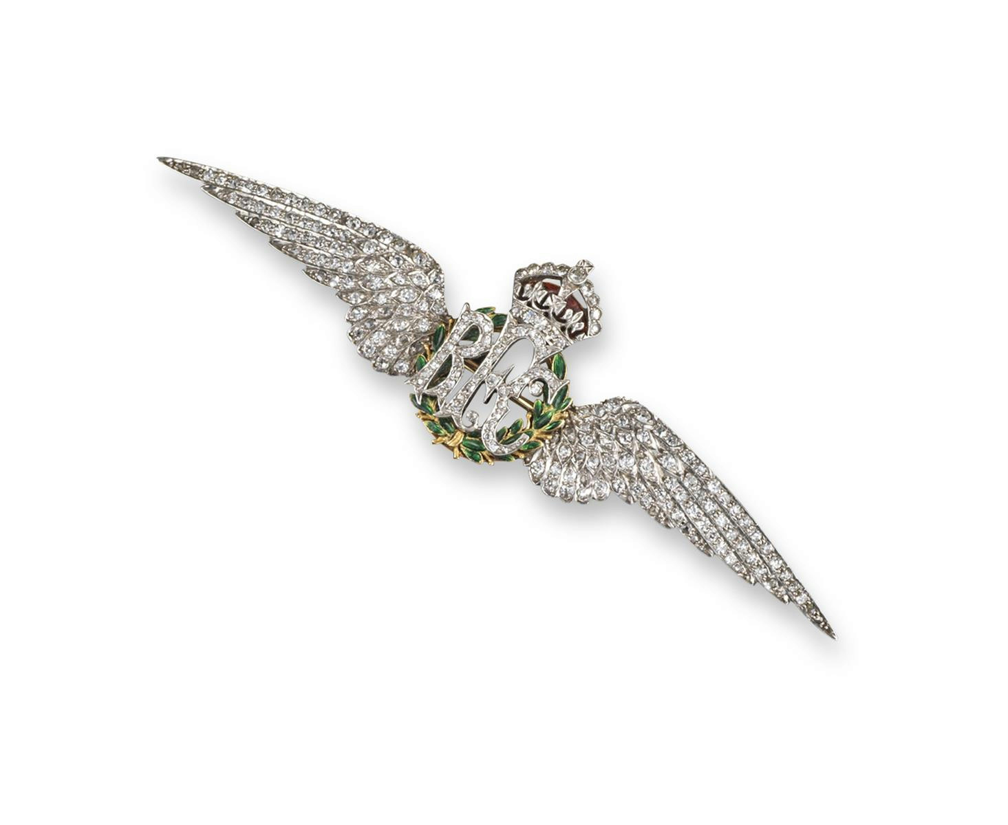 A Regimental brooch for the Royal Flying Corps, the impressive brooch set overall with circular-cut diamonds in platinum and gold with enamel decoration. 9.5cm wide. Case.
