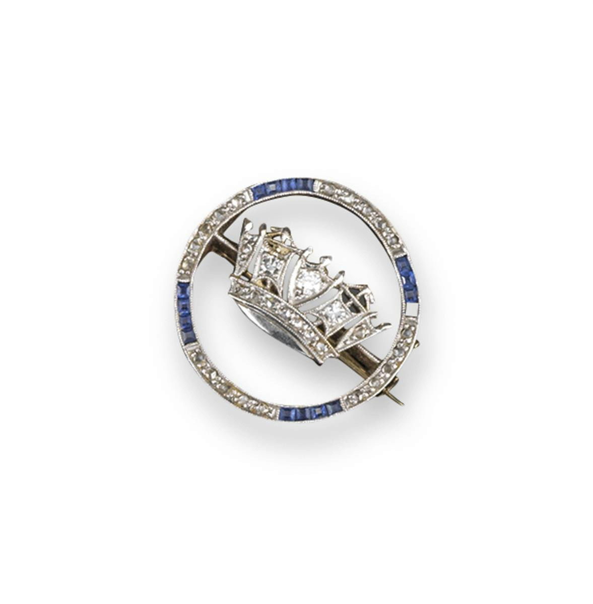 A diamond and sapphire set Royal Navy circular brooch, set in platinum and gold, (missing one sapphire). 2.1cm wide.