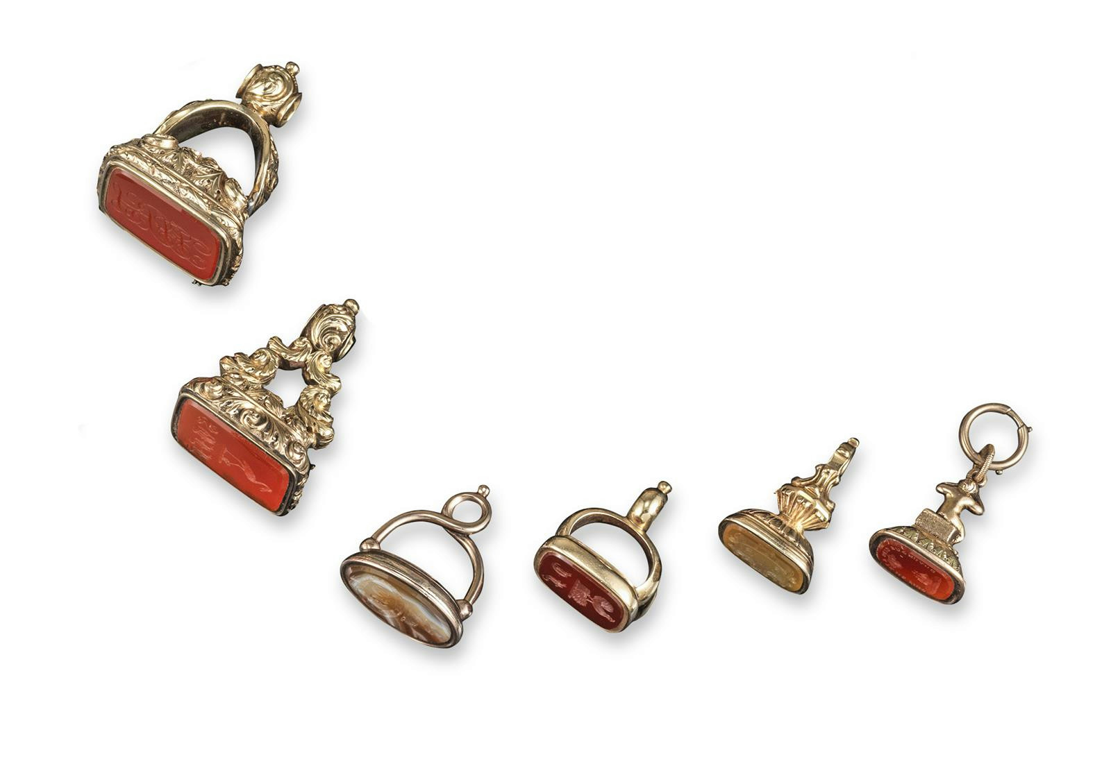 Seven assorted fob seals, including an early 19th century gold seal mounted with a puti seated on a casket, the carnelian matrix engraved with a sailing ship and the motto Dovunque Giroatemefido, 2 cm high. A George III stirrup form fob seal, the banded agate matrix engraved with a cockerel and wheatsheaf crest over initials and motto, 2.5cm high. A George III gold rectangular fob seal with snake body and the rectangular chalcedony matrix engraved Louisa. 2cm high. And three other fob seals.