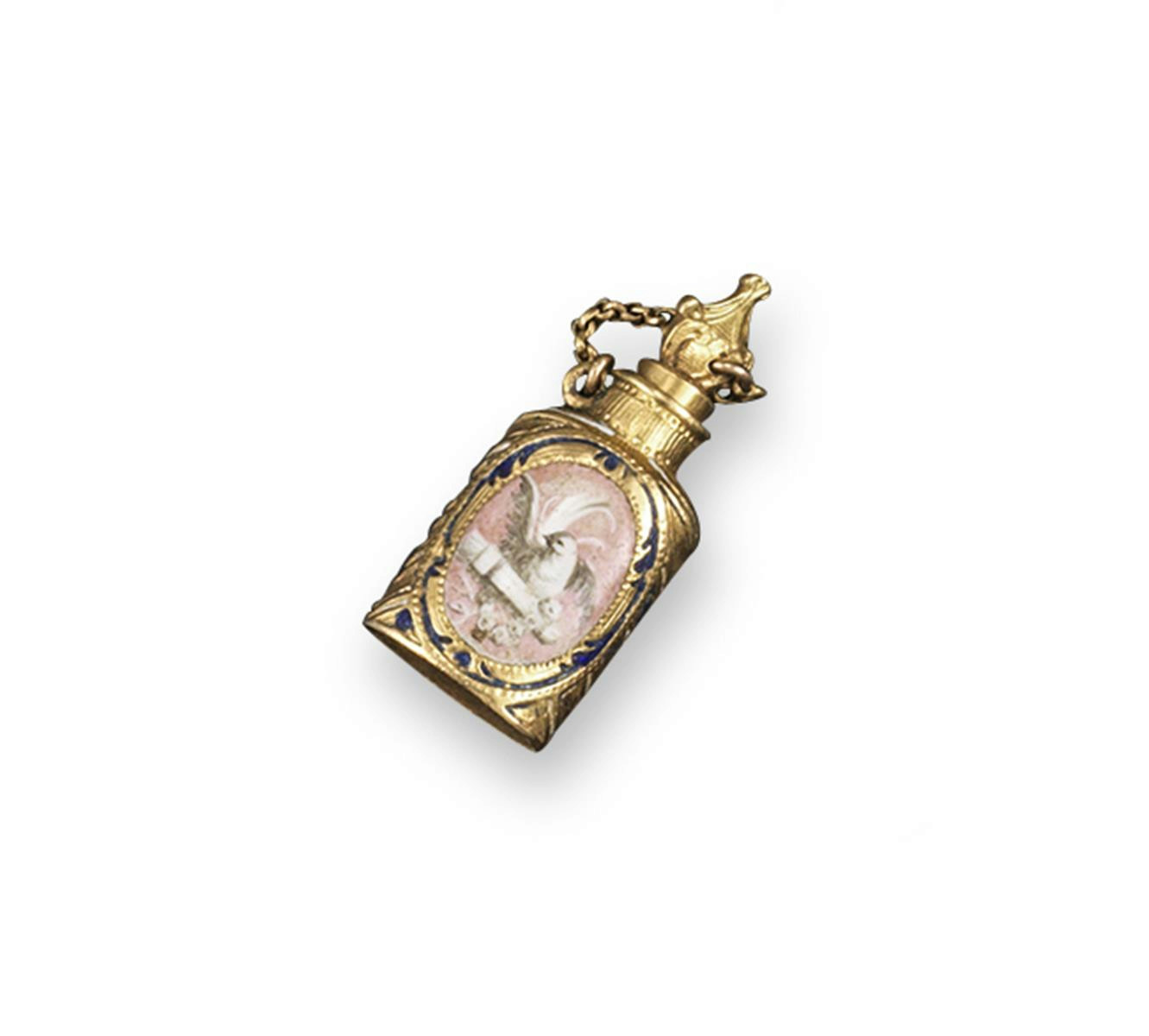 A small gold 19th Century scent flask, painted with enamel doves to both sides and further blue enamel decoration, the stopper connected with fine link chain. 2.5cm high.