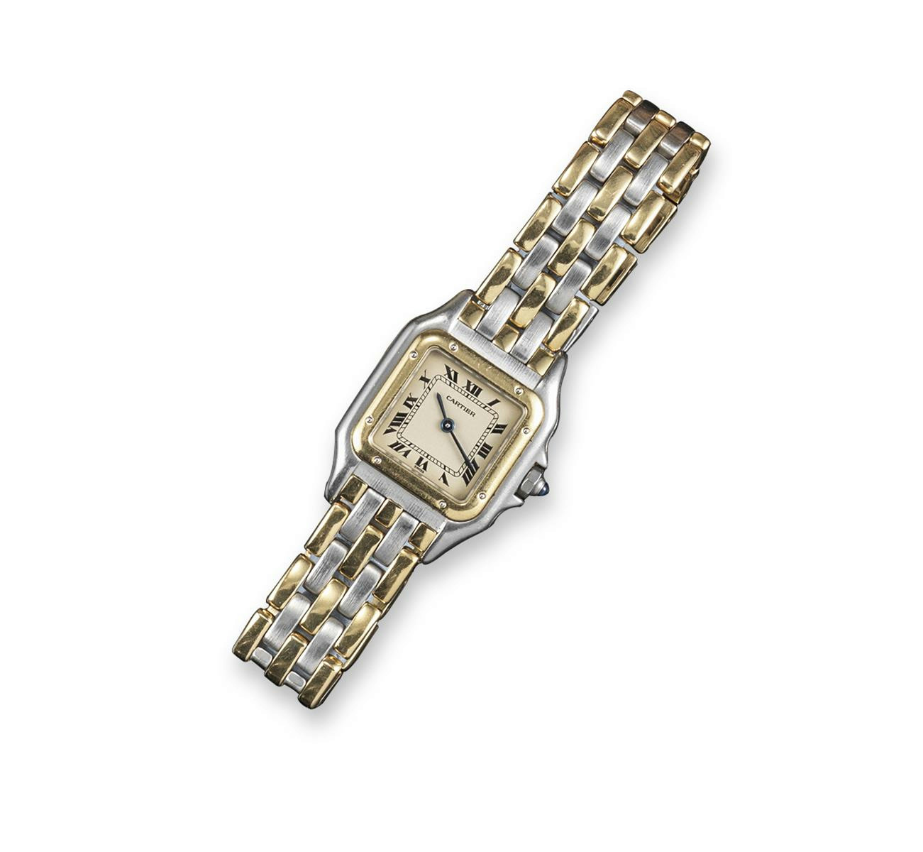 A lady's steel and gold Panthere wristwatch by Cartier, signed square dial with secret signature at seven. With black Roman numerals, steel and gold band with Cartier deployant clasp. Quartz movement.