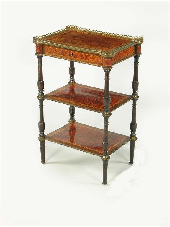 A 19th century French three tier tagre, the burr yew veneered top with kingwood crossbanding to a rosewood edge, with gilt brass mounts and a frieze drawer, 29.75in (75.6cm) h, 19.75in (50cm) w, 14.75in (37.5cm) d.