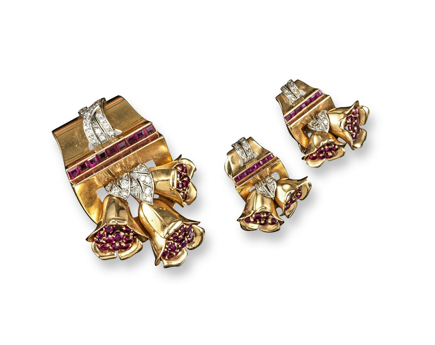 A 1940s gem-set floral brooch with matching earrings, set overall with rubies and diamonds in gold. 55g in total. With Boucheron case.
