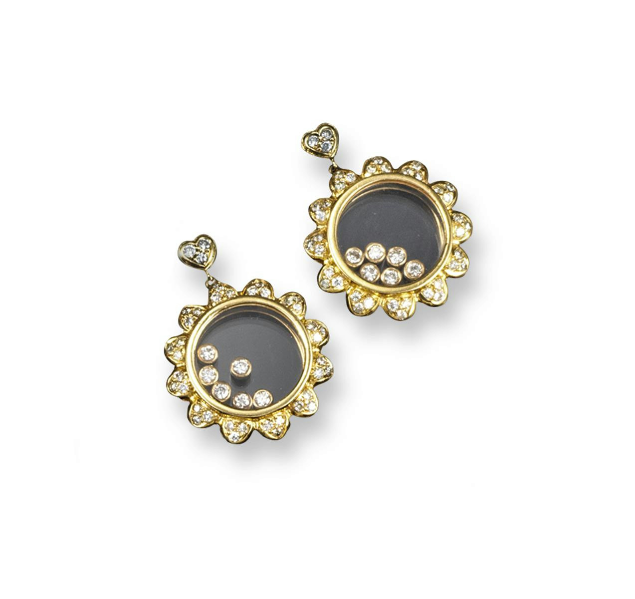 A pair of diamond set drop earrings, each with a glazed circular section containing six free moving round brilliant-cut diamonds in gold rubover closed-back mounts. Within a border of smaller circular-cut diamonds and suspending from a diamond-set heart-shaped upper section.