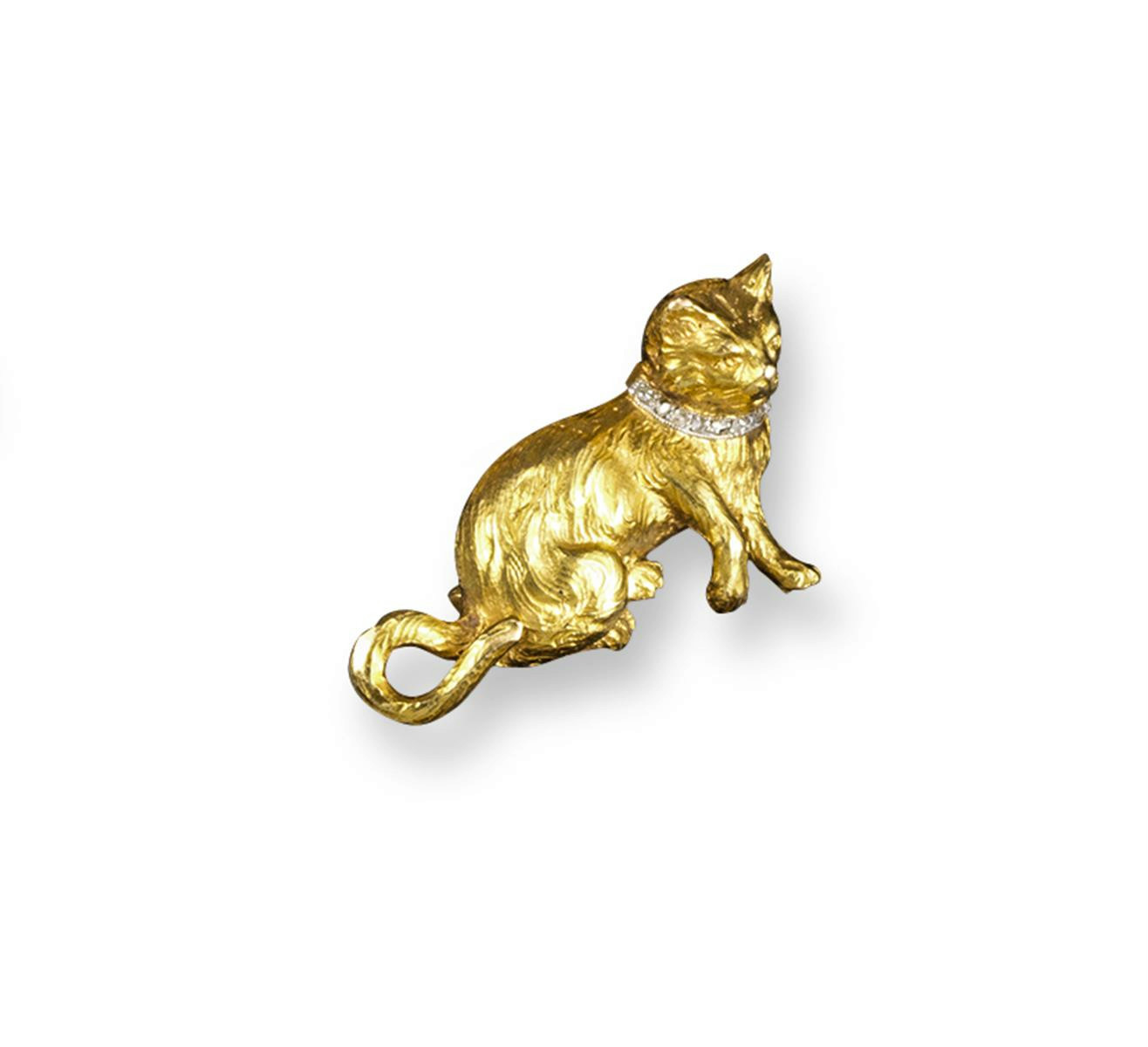 A gold cat brooch, the realistically formed cat is set with a diamond-set collar in yellow gold. 3.2cm wide.