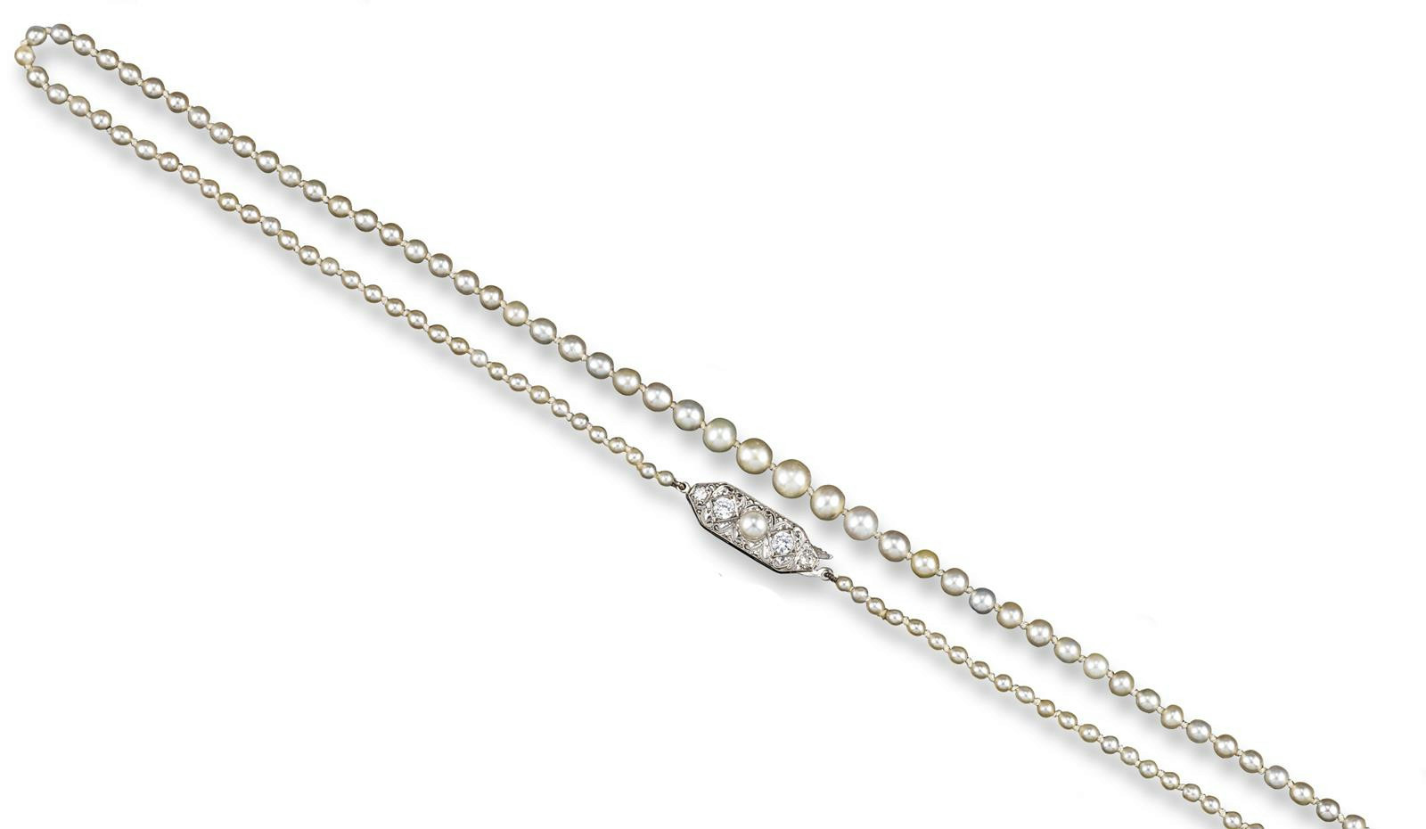 Accompanied by report number 11316 dated 15th May 2015 from GPL, London stating that the 126 pearls graduate from 2.5mm to 6.3mm, weigh 12.93g (including clasp) and with the exception of fourteen marked bead nucleated pearls are natural saltwater pearls.