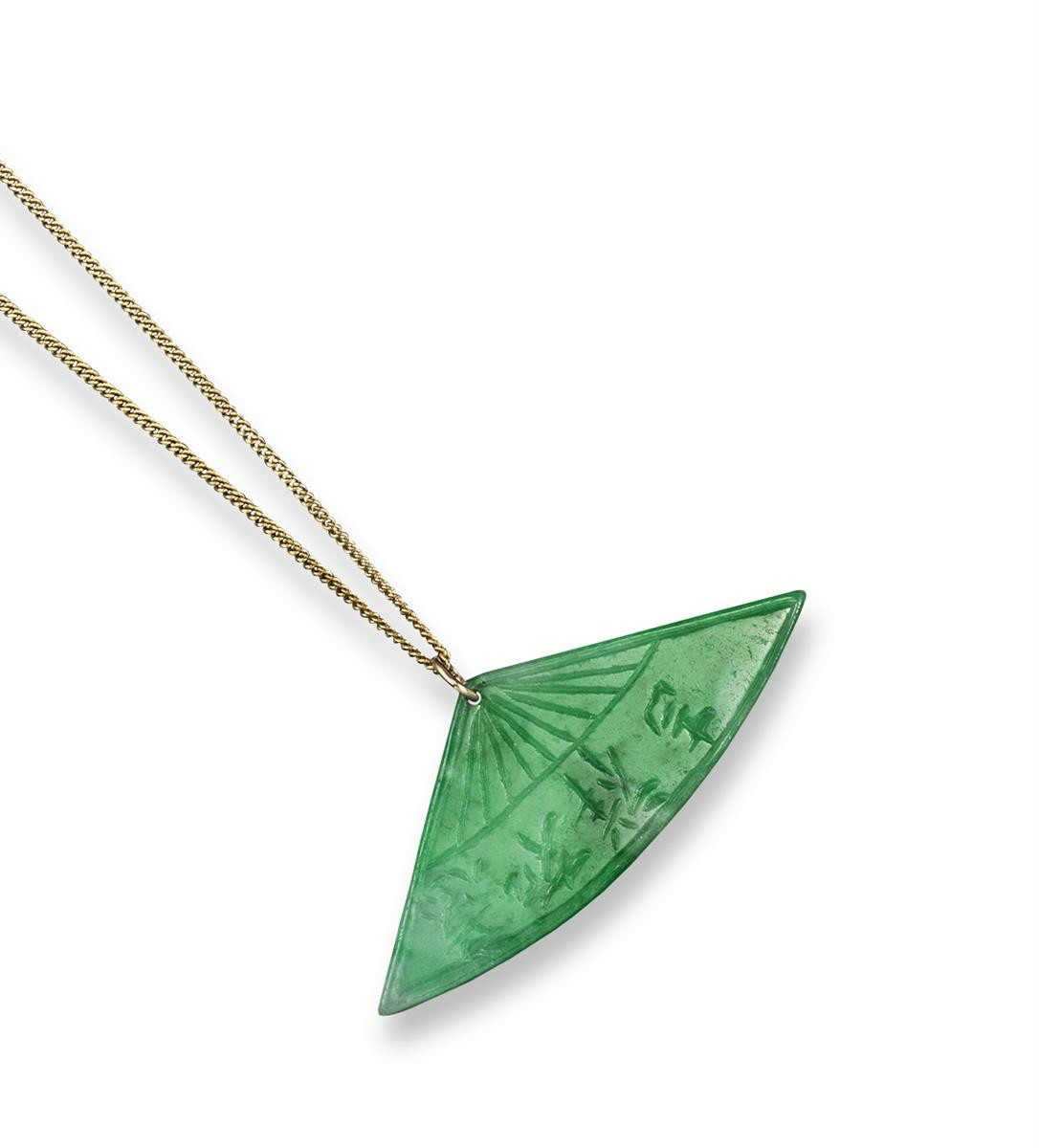 A carved fan-shaped jade pendant, engraved with Chinese characters. 6cm wide. On a fine link gold chain.