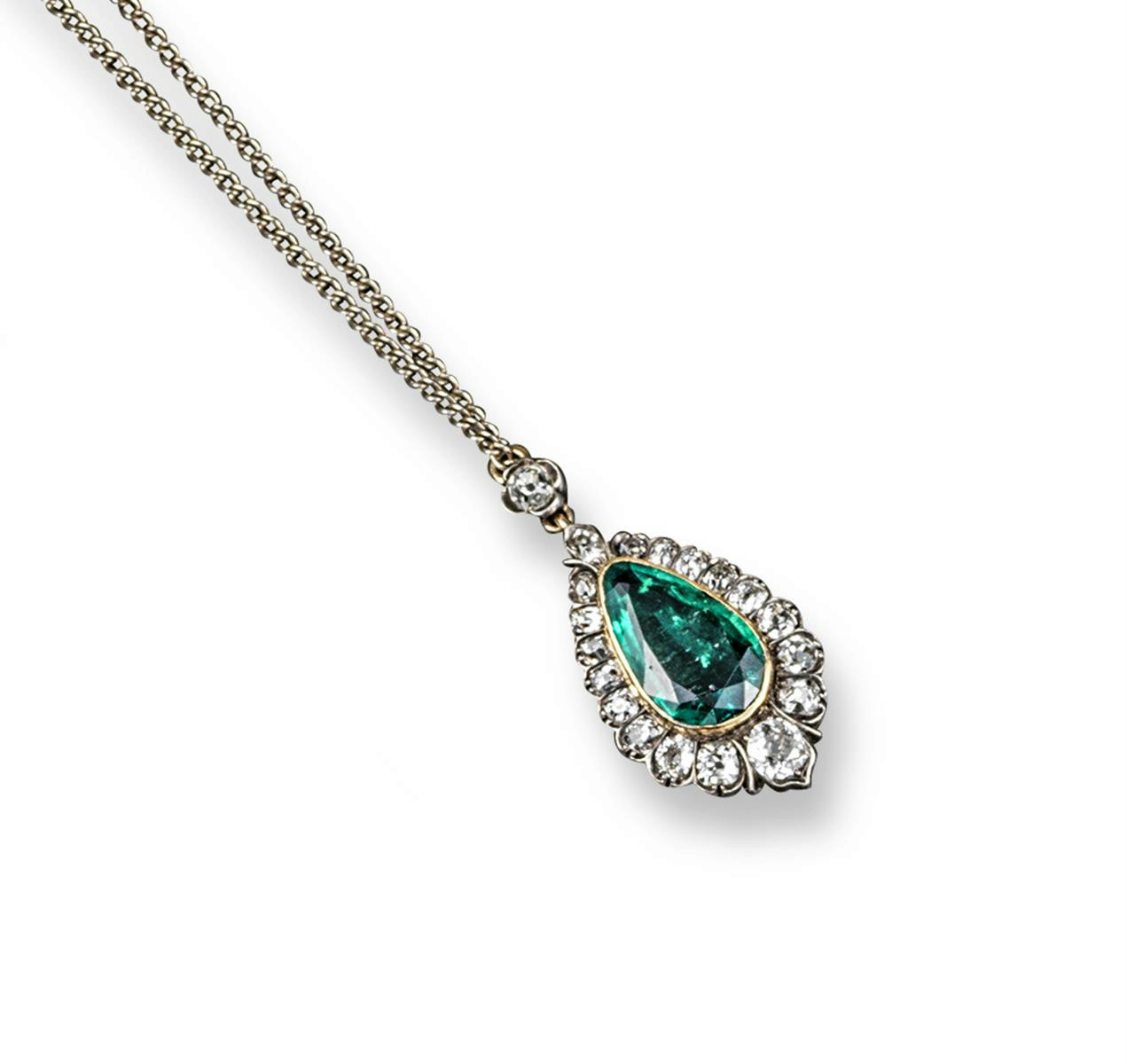 An emerald and diamond-set pendant, the pear-shaped emerald is set within a surround of graduated cushion-shaped diamonds in silver and gold. Suspended from a further cushion-shaped diamond on a fine-link neck chain.