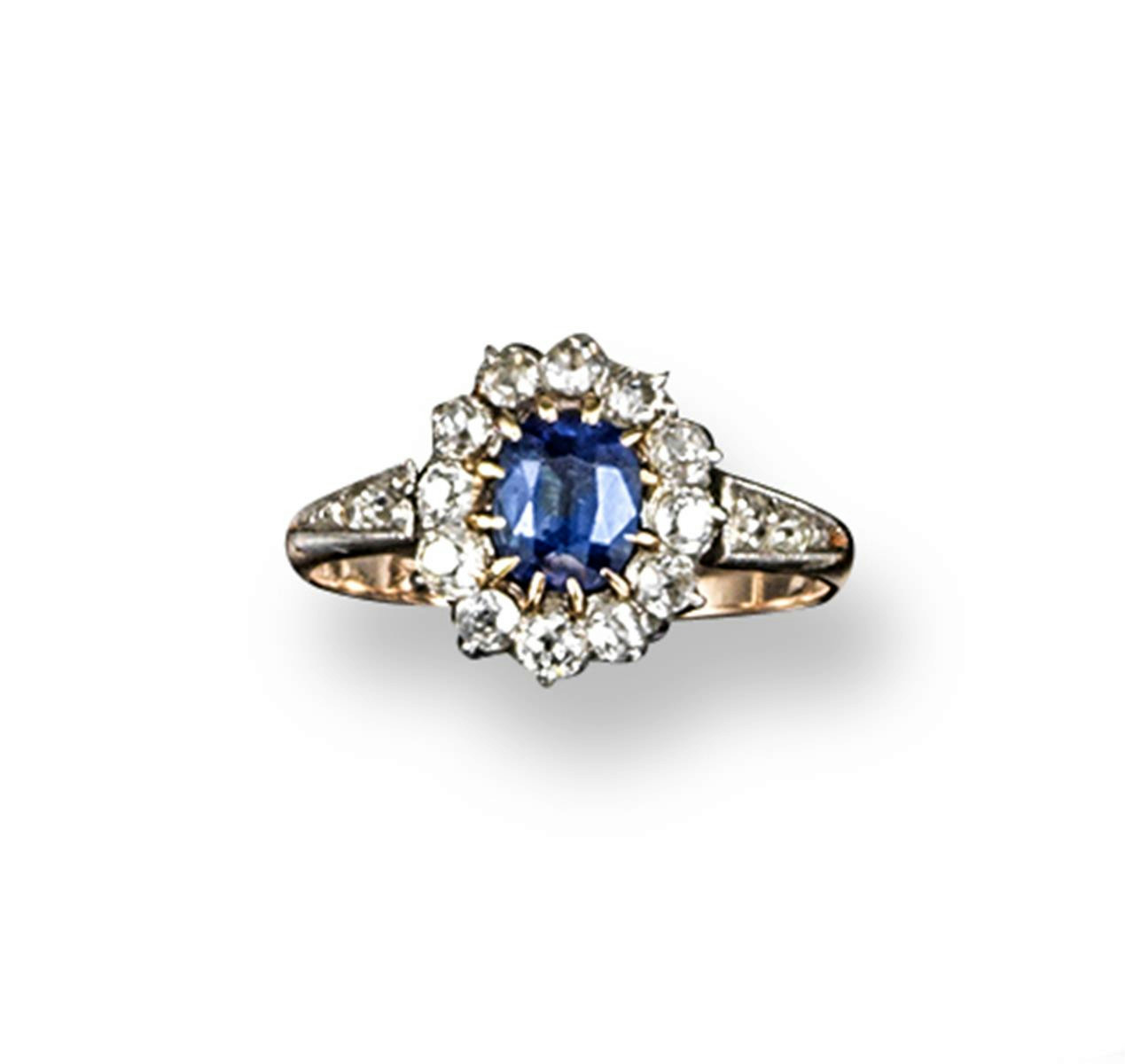 A sapphire and diamond cluster ring, the oval-shaped sapphire is set within a surround of twelve old circular-cut diamonds with smaller diamonds set to the shoulders in gold and platinum. Size R.