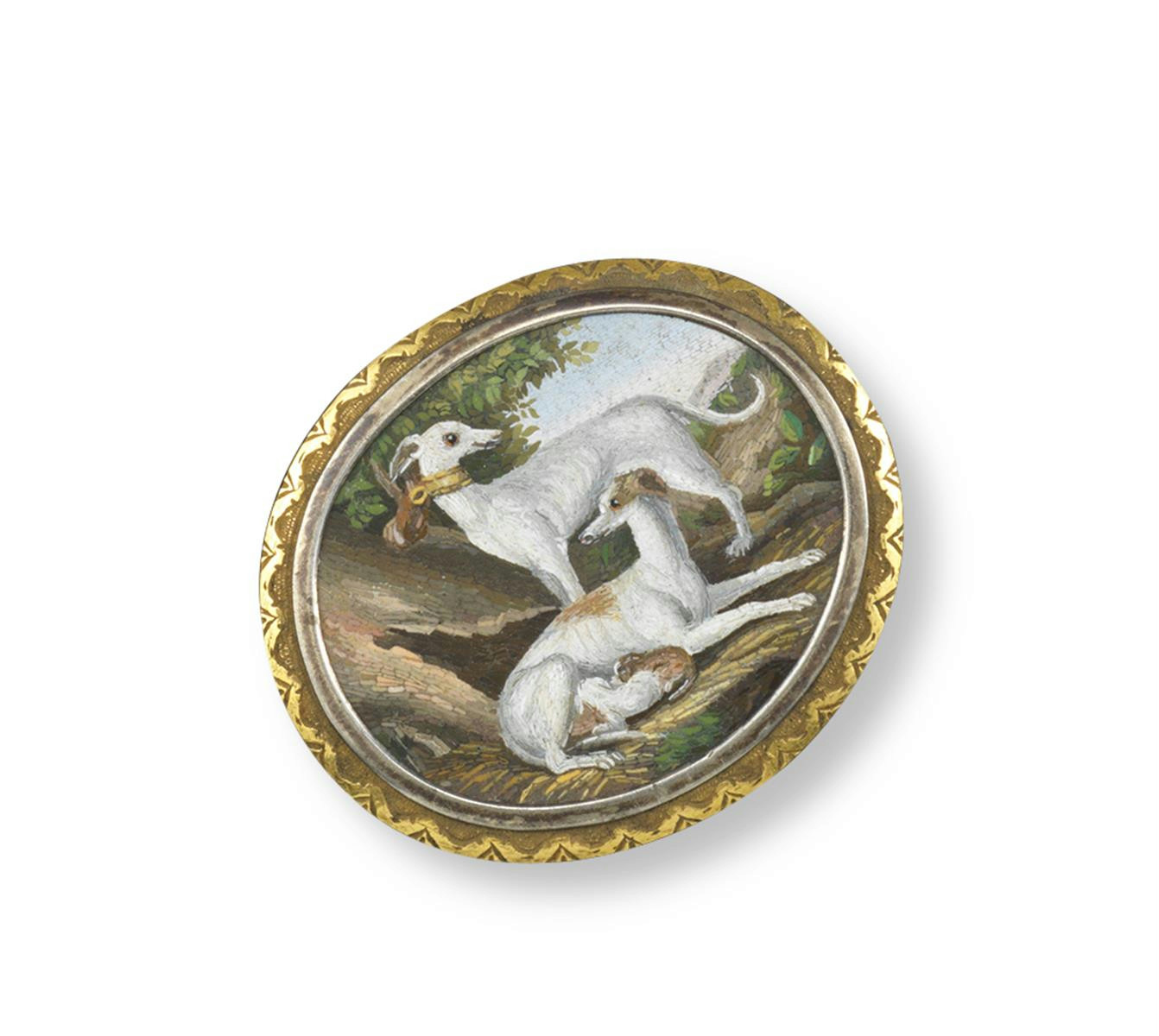 An early 19th century oval micromosaic plaque depicting greyhounds, the dog standing and wearing a collar, the recumberant bitch with two suckling pups with rural scene beyond. 3.8cm wide. Engraved gilt metal mount and copper base.
