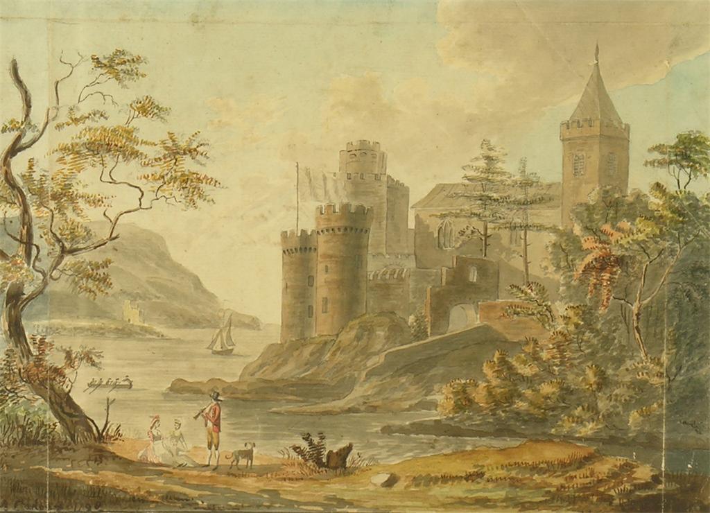 M.Cadoux. Figures by a lakeside castle, watercolour, signed and dated 1798, the verso inscribed 'M Cadoux fecit et pinx 1798, R M Academy, Given by him to Mrs Percivall as a Token of Friendship, April 21st 1799', 7.5 x 10.5in (19 x 26.6cm).