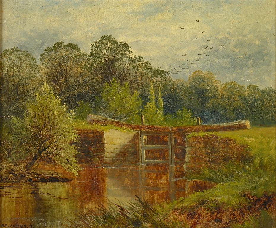 W.R. Whitby, 1877. River landcape with a lock, oil on canvas, signed and dated, 10.25 x 12in (26 x 30.5cm).