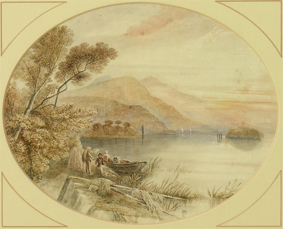 English School, 19th century, figures by a lake, watercolour, 8 x10in (20.2 x 25.4cm).