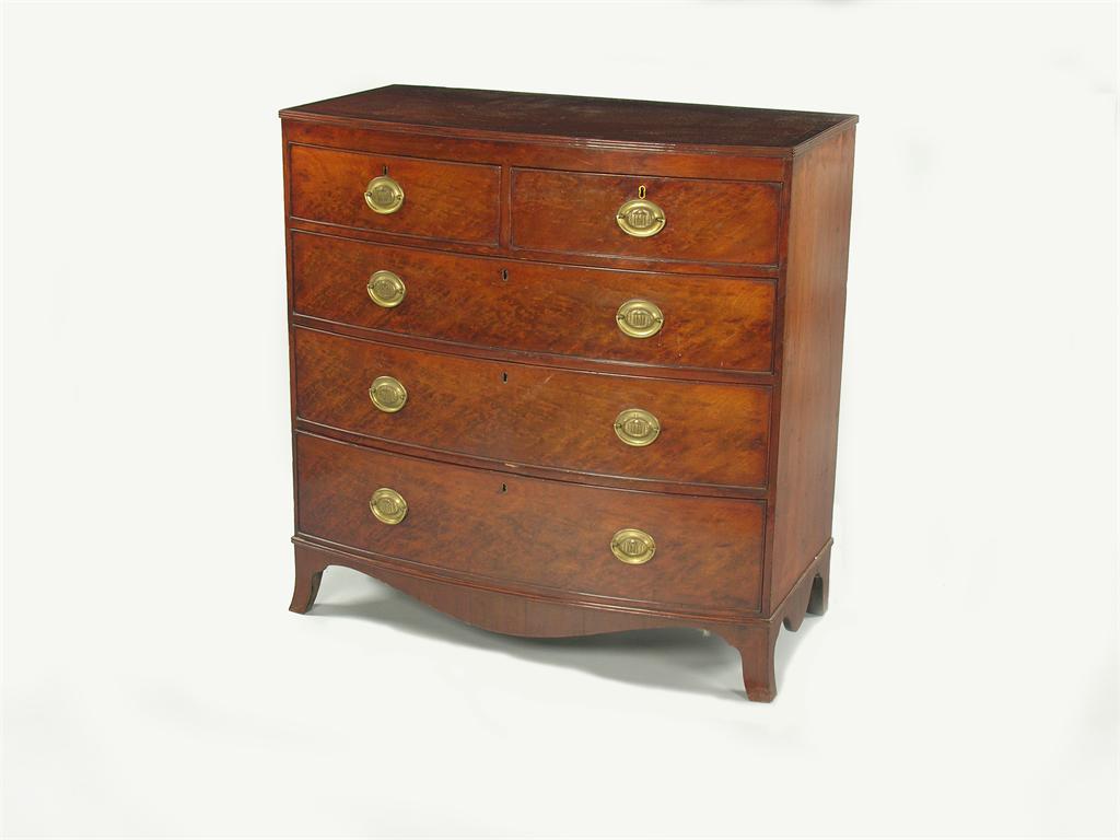 A George IV mahogany bowfront chest, the crossbanded top inlaid boxwood stringing above plum pudding veneered drawers fitted later oval brass collonade handles, 41.75in (106cm) h and wide, 21.75in (55.2cm) d.