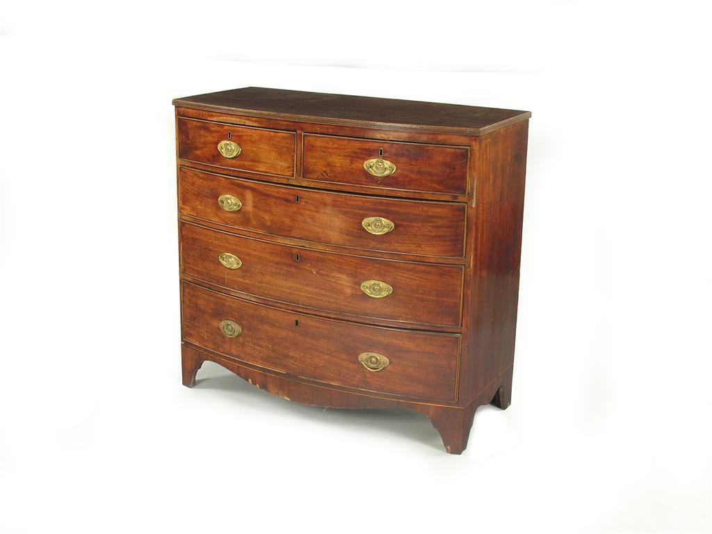 An early 19th century mahogany bowfront chest, the oak lined drawer fitted later brass plate handles, 39.5in (100cm) h, 42.5in (108cm) w, 21in (53.2cm) d.