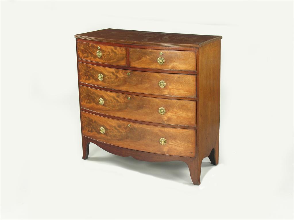 A George IV mahogany bowfront chest, the oak lined drawers fitted later brass handles, the locks stamped 'Patent, Crowned', 40.75in (103.5cm) h, 41in (104cm) w, 21.5in (54.5cm) d.