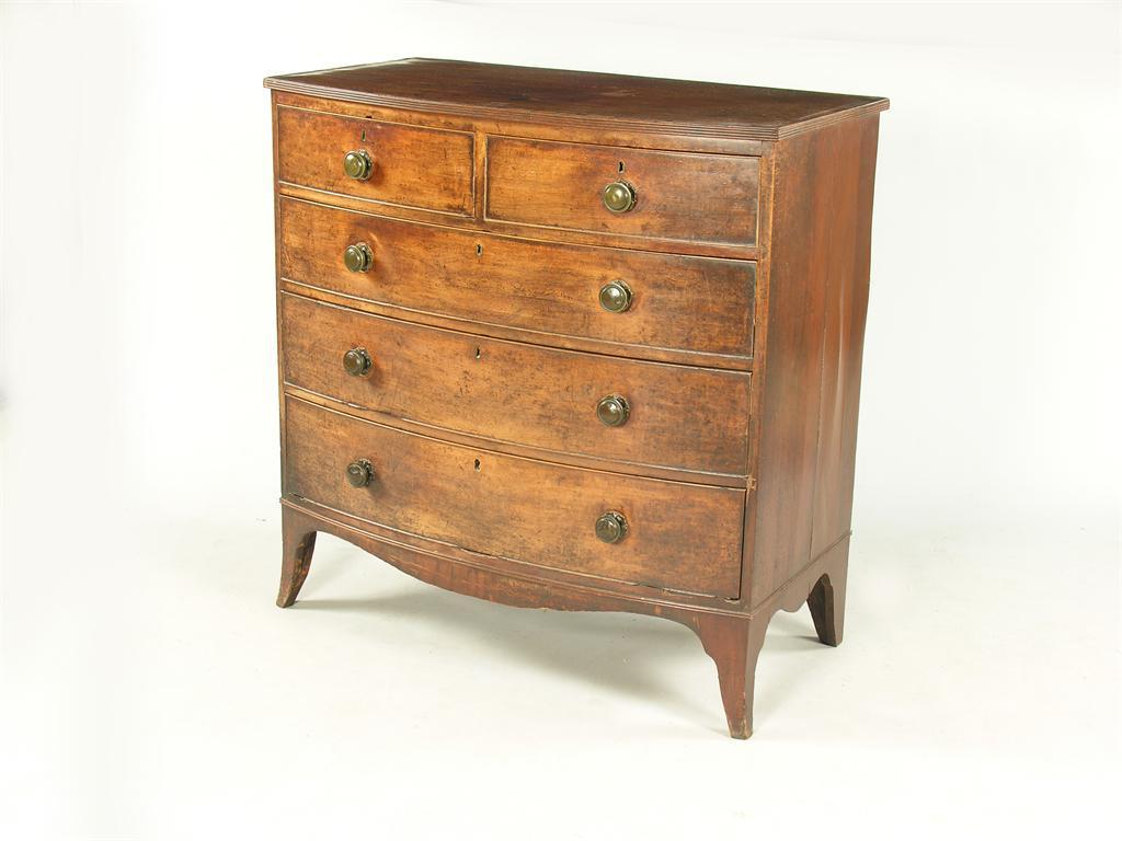 An early 19th century mahogany bowfront chest, the cross banded top inlaid stringing to an applied reeded edge, the oak lined drawers fitted brass floret plate knob handles, later back, 42.5in (108cm) h, 42.5in (108cm) w, 22.5in (57.2cm) d.