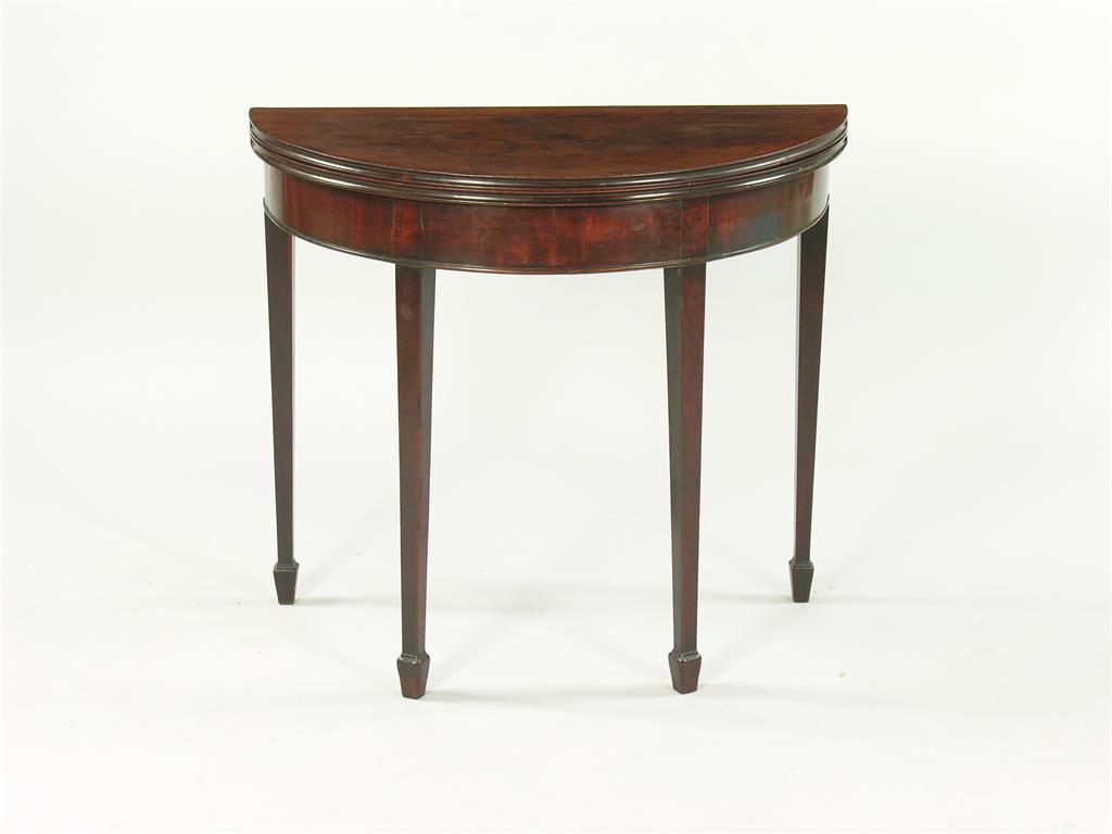 A George III mahogany demi-lune tea table, with a channelled edge and double gates, 28.25in (72cm) h, 32in (81cm) w, 16in (40.5cm) d.