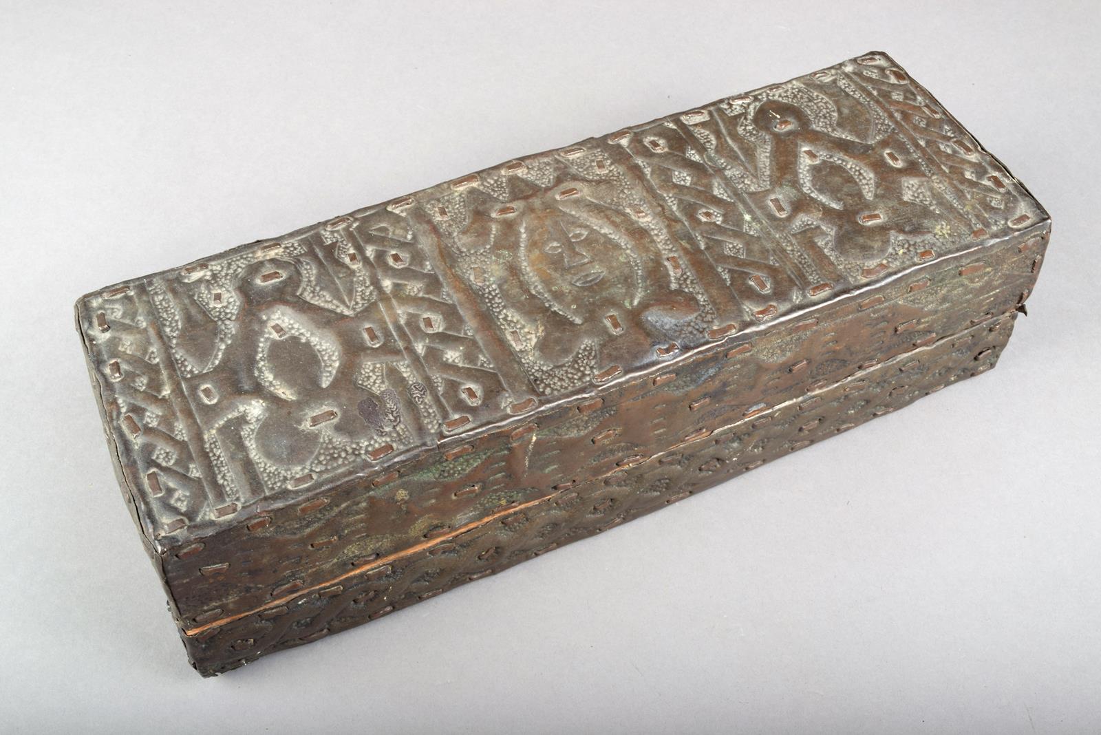 A Benin wood and sheet brass mounted rectangular box, the top decorated with a Portuguese mask, flanked by images of swords, with geometric pattern borders, the metal applied with staples, 33cm long.