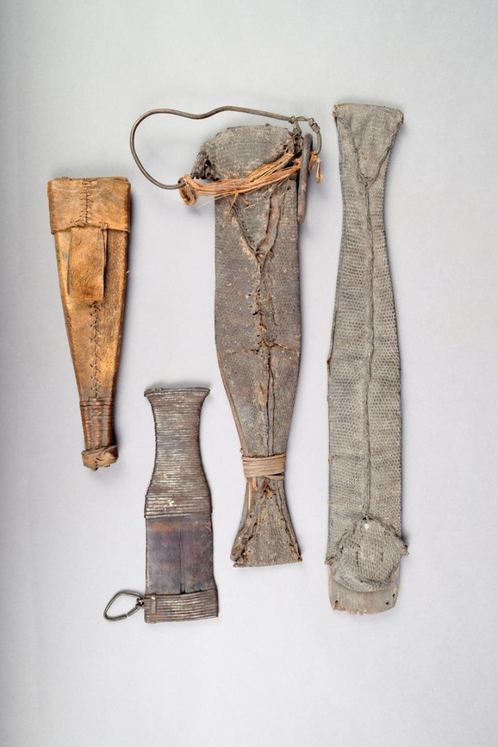 Four Fang knife scabbards, Gabon; two covered with reptile skin, one with vellum and the fourth with metal wire, 40cm, 33.5cm, 21cm and 18cm long. (4)