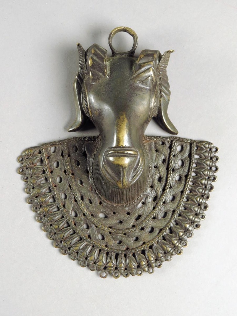 A Benin bronze hip mask, with rams head, 20.6cm wide.