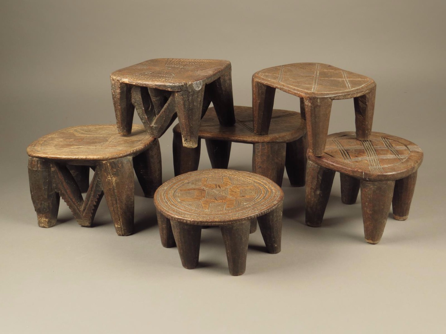 Six Nigerian wood stools, with geometric patterned tops, two with 'V' shape supports, the highest 14.5cm. (6)