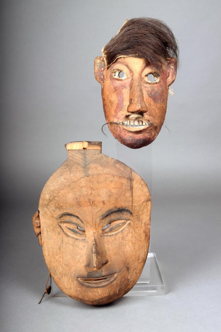 A Makonde mask, Tanzania, with applied animal hair, with remains of red pigment, 20.5cm high, and a Dayak carved wood mask, 28cm high. (2)