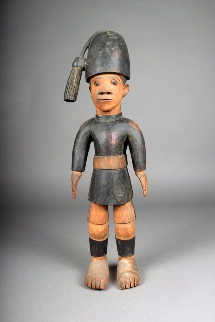 A Nigerian Colon carved standing figure, wearing a hat with tassel, 51.5cm high.