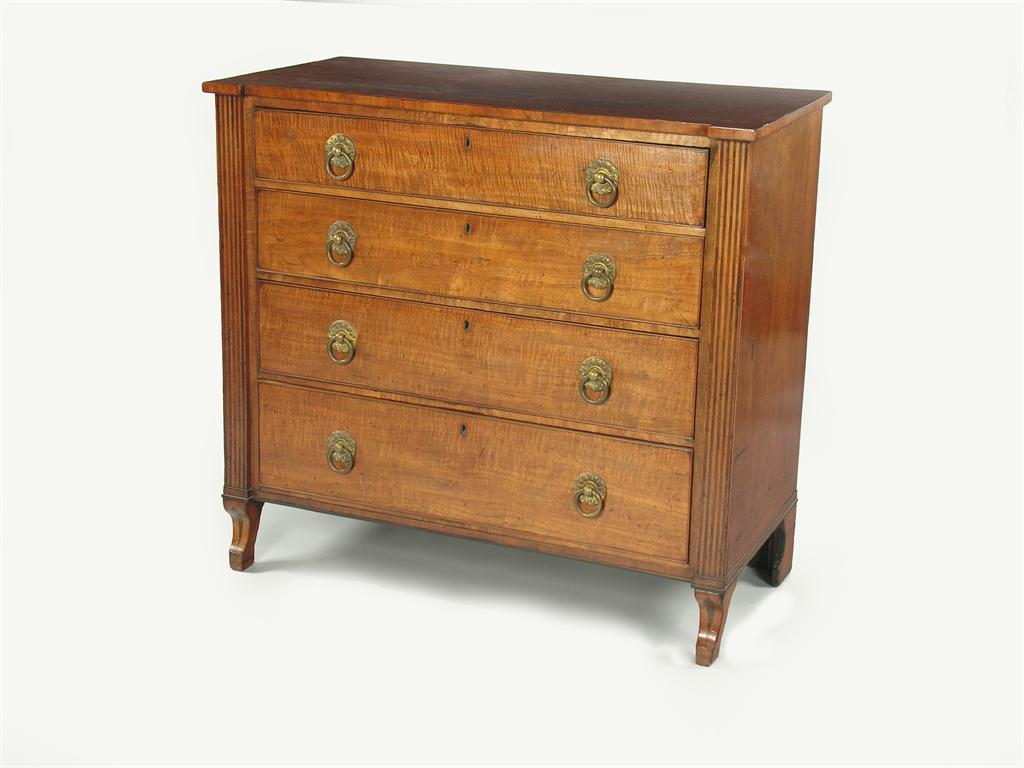 An early 19th century mahogany chest, the four long fiddle back drawers fitted brass ring handles, flanked by inlaid faux fluted pilasters, on scroll feet, 39.5in (100.2cm) h, 43.25in (110cm) w, 21.5in (54.6cm) d.