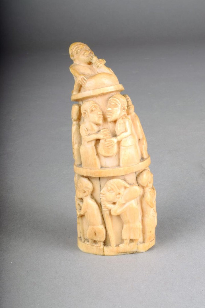 A Loango carved hippopotamus tusk, Angola, with bands of figures in native and colonial dress, 11.5cm high.