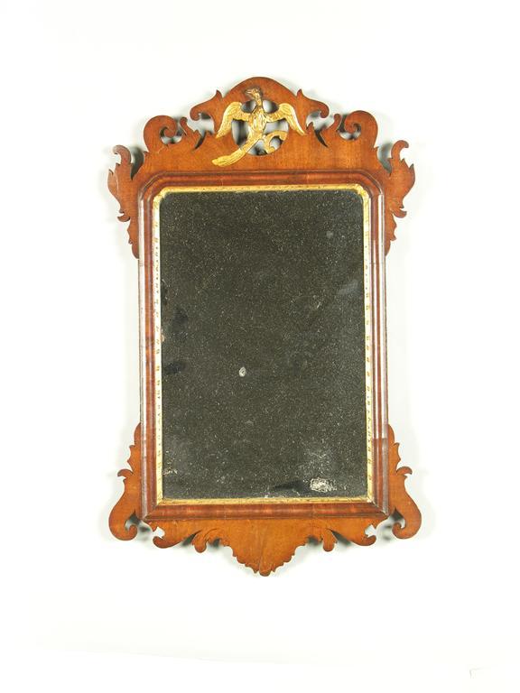 A mahogany and parcel gilt fret frame mirror, the surmount pierced a ho-ho bird, 28.75 x 18in (73 x 45.7cm).