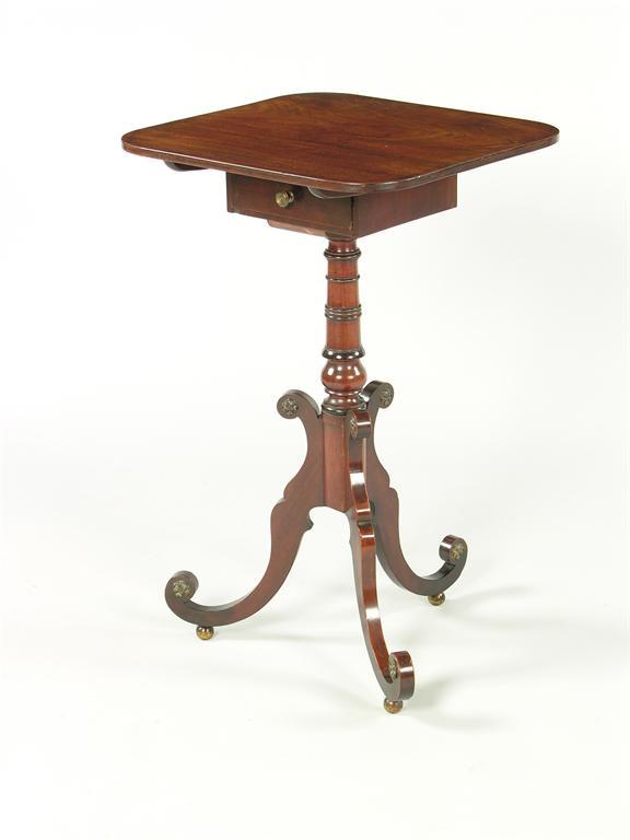 A late Regency tripod table, the tilt-top inlaid stringing to the outer edge, hinged on a block, fitted a drawer to a ring turned and parcel ebonised stem with shaped scroll legs applied gilt brass florets on ball feet, 29.5in (75cm) h, 18.5 x 17in (47 x 43cm).