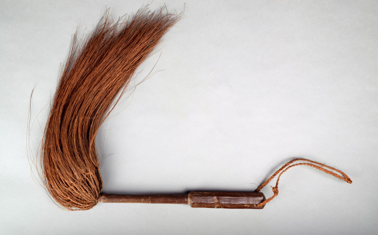 A Fiji fly whisk, wood and coir sennit fibre, with a faceted handle and tapering cylindrical shaft, 34cm long.