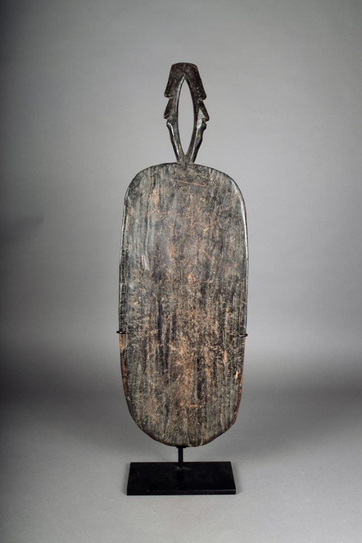 A Sepik River wood dish, Papua New Guinea, with a shallow bowl and stylized mask open handle, 72cm high, on a stand. (2)