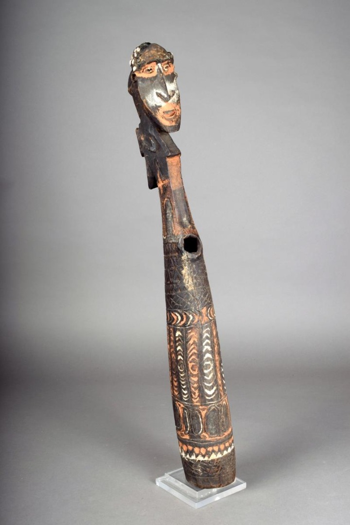 A Sepik war trumpet, Papua New Guinea, carved with a mask with applied shells, with bird behind and with a carved body, pigment decoration, 65cm long.
