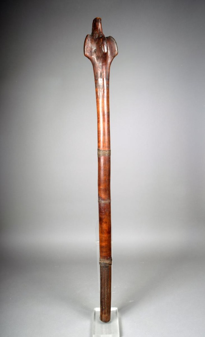 A Fiji war club, wake vividrassa, with a root nodule head on a cylindrical shaft with remains of fibre binding, with a zig zag carved grip, 109.5cm long.
