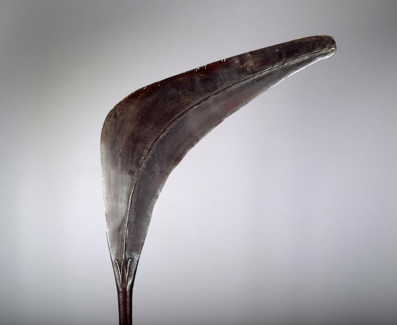 A Solomon Islands dance paddle, with a crescent blade and medial ridge terminating in a W symbol, representing frigate birds, with a knopped tapering shaft, 159.5cm long, with a stand. (2)