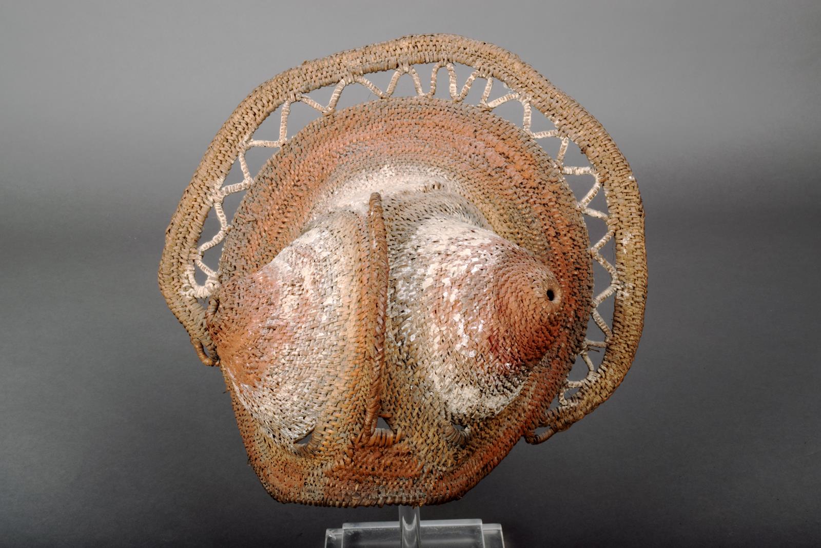 An Abelam Yam mask, Papua New Guinea, woven fibre with pigment decoration, 21cm high.