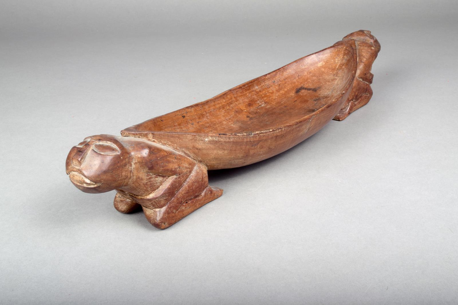 A Marquesas Islands ceremonial dish, carved wood of eliptical form with kneeling figural ends, 52cm long.