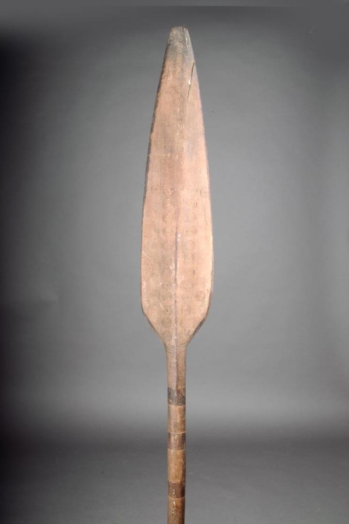 A hardwood paddle, decorated with circles and with blackened bands and with a square grip, 125cm long.