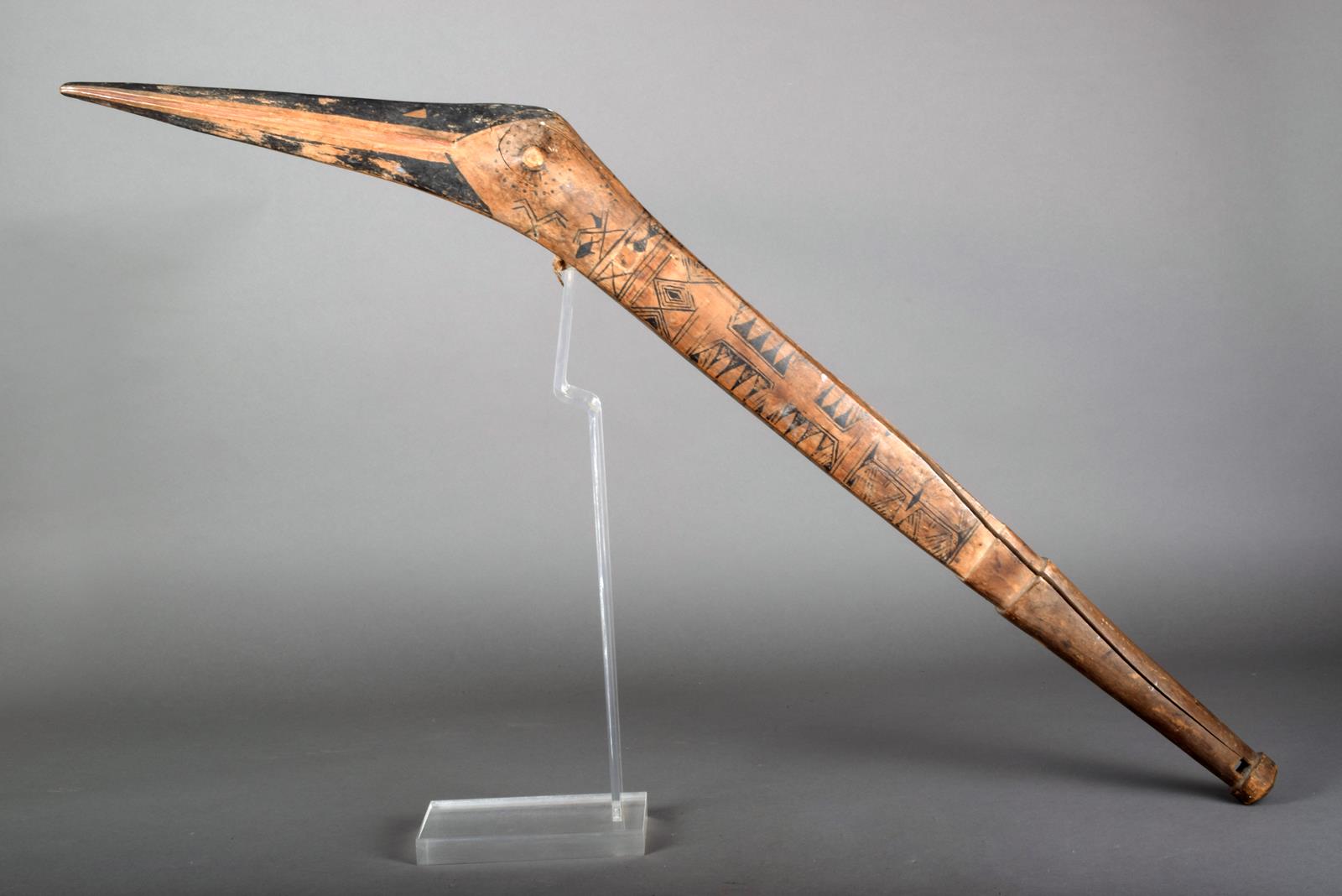 A Santa Cruz dance club, Solomon Islands, of angled form with a birds' head and geometric painted decoration with birds and fish, with a tapering handle, pierced towards the end, 99cm long.