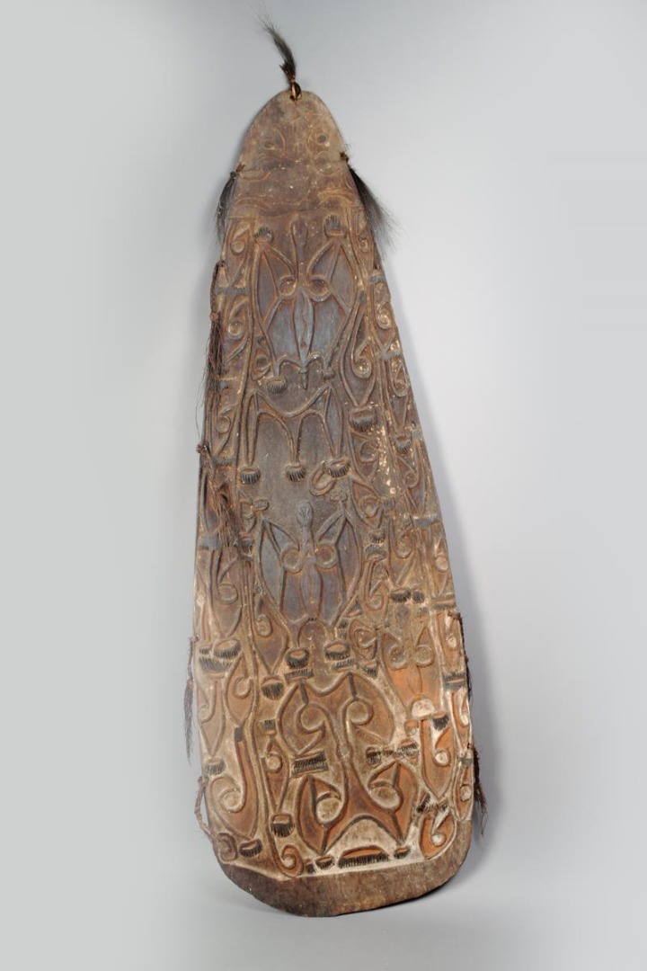 An Asmat shield, Papua New Guinea, relief carved figures, with remains of pigment decoration and tied feathers, the reverse integral handle and geometric pigment decoration, 175cm high.