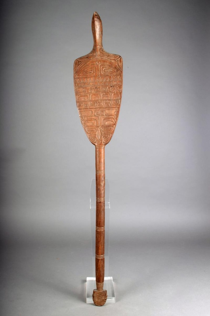 A Marquesas Islands ceremonial paddle, the blade with shaped spur and carved decoration, the ribbed shaft with semi-circular finial carved tiki masks, 95cm long.