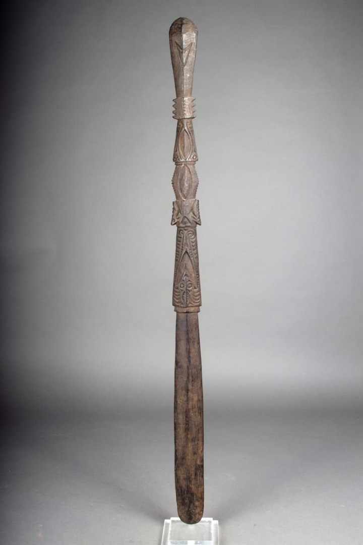 A Papua New Guinea large lime spatula, the handle carved with ancestor figures and masks, 87cm long.