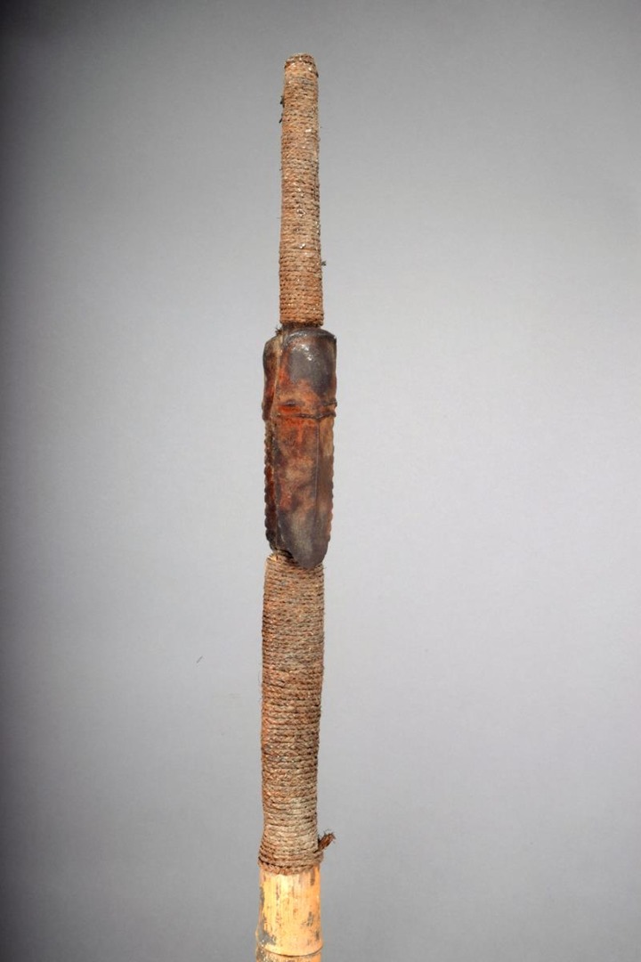 A Banks Islands Janus head spear, with remains of pigment decoration with woven fibre on a bamboo shaft, 214.5cm long.