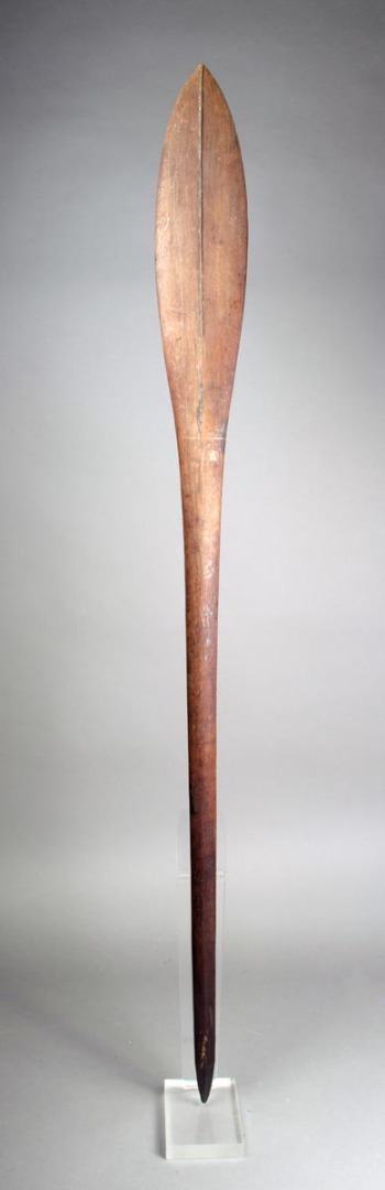 A Solomon Islands paddle club, Melanesia, with a leaf shape blade having medial ridges, with a tapering shaft and faceted point terminal, 133.5cm long.