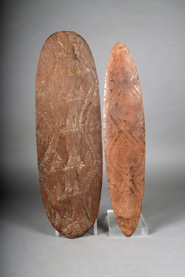 An Aboriginal churinga, of eliptical form, with incised circles, arches and lines to both sides, with remains of ochre, 48.5cm long, and an Aboriginal churinga, oblong with incised linear decoration, the reverse with a textured finish, 52cm long. (2)