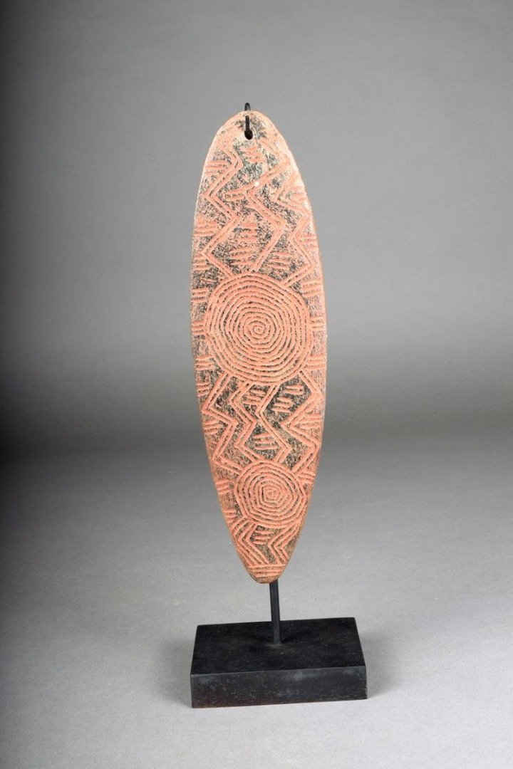 An Aboriginal stone churinga, of eliptical shape with incised two spirals issuing zig-zag and with dashes to one side, the other with a spiral issuing a six line zig-zag and other linear decoration, with ochre pigment, one end pierced, 25.2cm long, on a stand. (2)